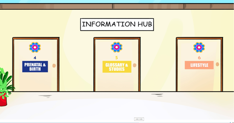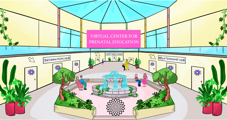 The virtual prenatal education center consists of three hubs: Relational, Informational, and Soft Skills, each containing three rooms. Each room contains several types of products: information capsules, videos, doodles, slideshows, case studies, applications, and educational games to provide solutions and answers to questions related to pregnancy, childbirth, and the behavior of future parents in order to provide harmonious conditions for the development of their future child.